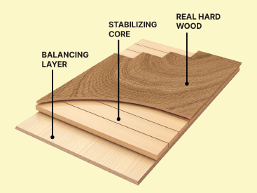 Engineered wood flooring consists of two or more layers of wood adhered together to form a plank. Typically, engineered wood flooring uses a thin layer (lamella) of a more expensive wood bonded to a core constructed from cheaper wood. The increased stability of engineered wood is achieved by running each layer at a 90° angle to the layer above.